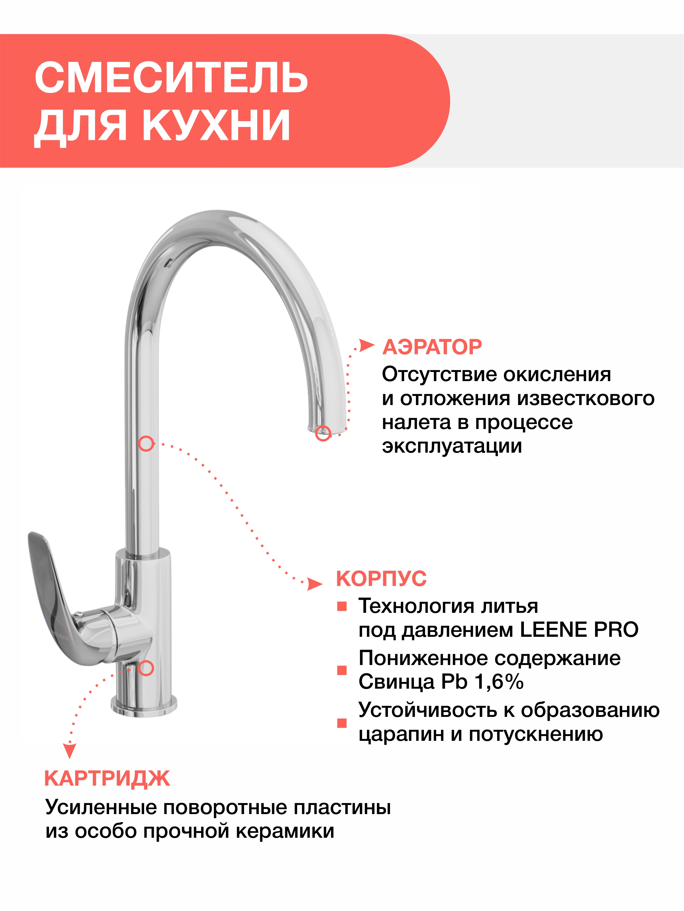 Смеситель для кухни AVRORA Glade AV3021 с высоким поворотным изливом